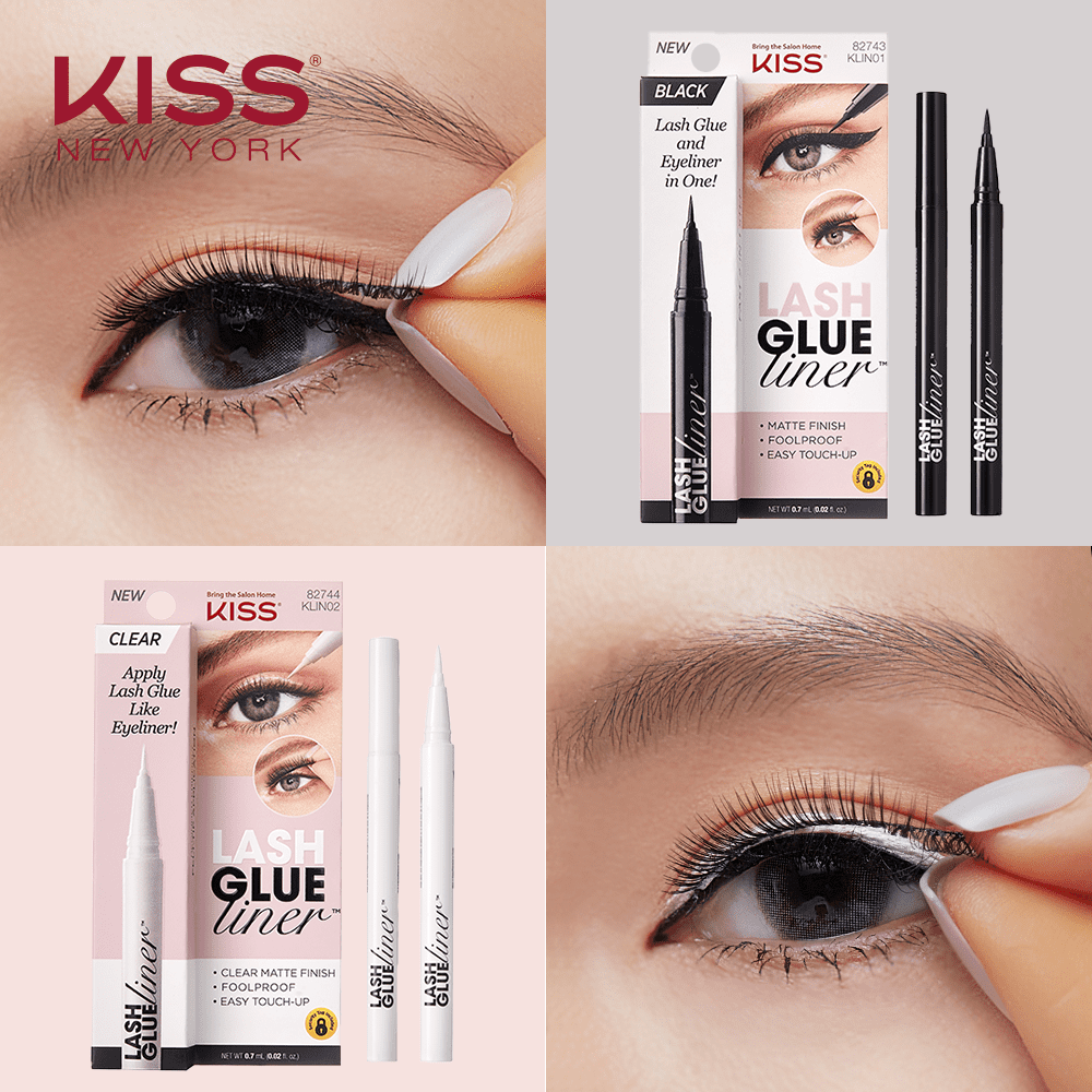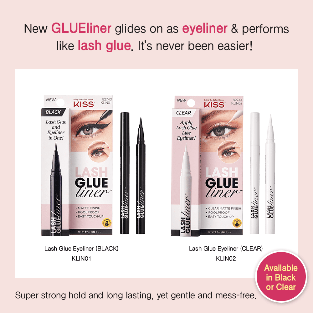 Next Level Lash Glue is HERE! Experts consider KISS lash glues and applicators to be the “gold standard”. Now, we’re taking it to a whole new level: GLUEliner (in Black or Clear) glides on as eyeliner & performs like lash glue. Simply line your upper lid, place lashes, and DONE! It’s never been easier!