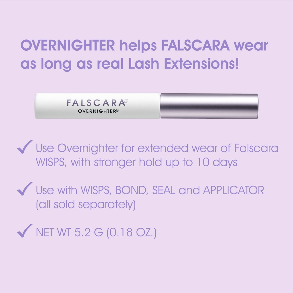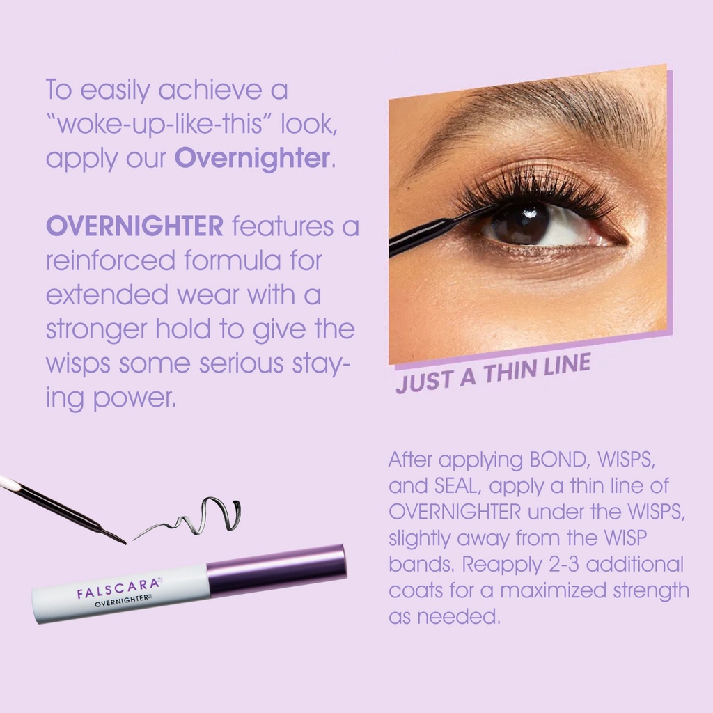 To use OVERNIGHTER for an extended wear, after applying BOND, WISPS, and SEAL, apply a thin line under the WISPS, slightly away from the WISP bands. Re-apply 2-3 additional coats for a maximized strength as needed