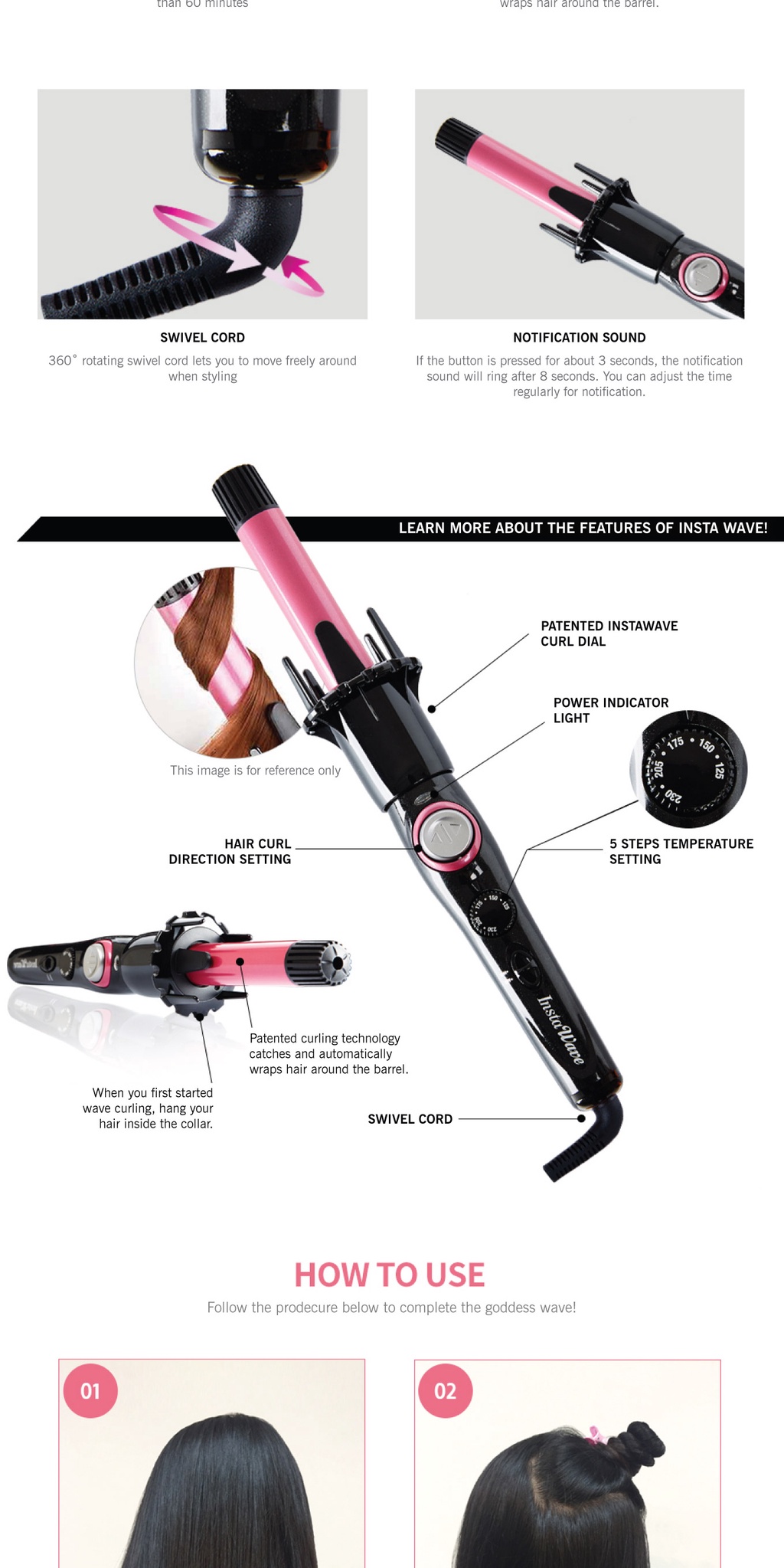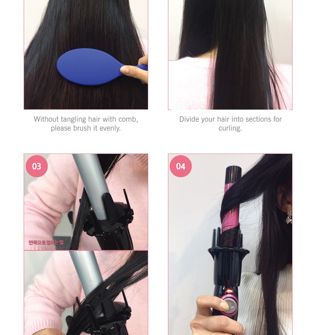 To begin: Take one or two inches of your hair, place hair behind the prongs, and press the button. The patented curl dial wraps every single piece of hair around the barrel with the prongs. The Pearl Ceramic technology evenly distributes heats all around the barrel helping to create the perfect curl. After approximately 10 seconds you will hear a beep. When you hear the beep, pull straight down and you will see the unbelievable curl.