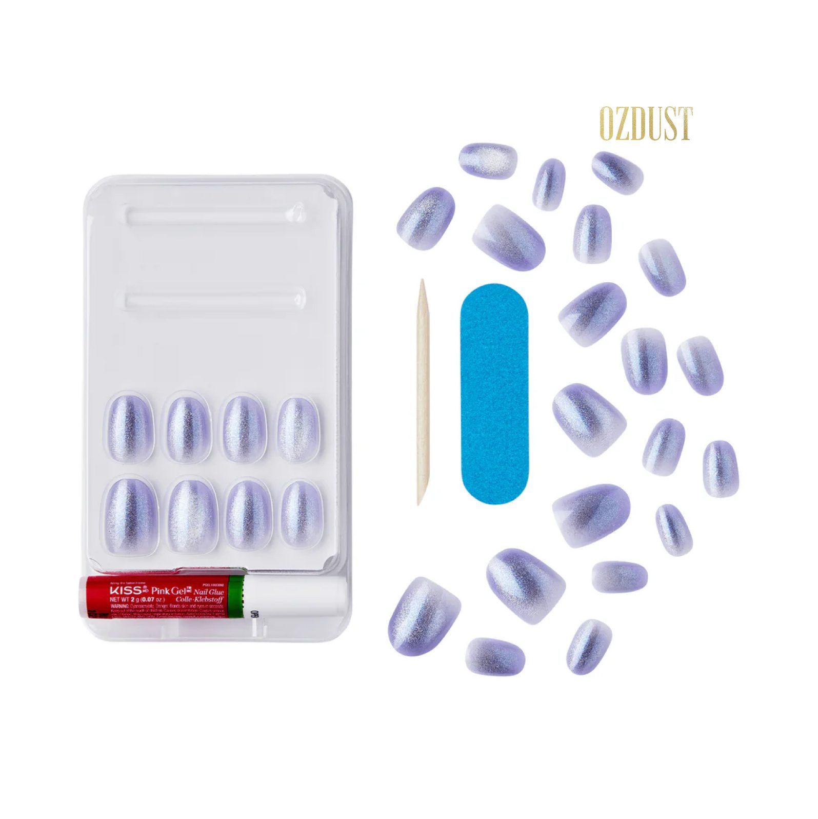 – 28 short oval glue-on nails in a blueish-lavender shimmer